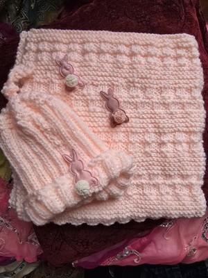 Peach Bunny Baby Blanket Boy Girl Hand Knit Artisan Made Wool Mix Beautiful Gift