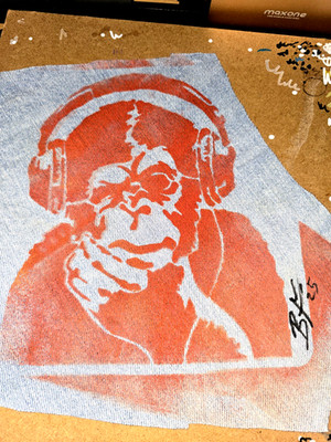 Banksy Stencil Monkey in Headphones Red on Blue Denim Blink Friction Surplus Art