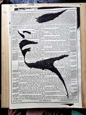 Hand-Printed Black Koi Carp Art on Vintage Book Page Original Blink Friction A4