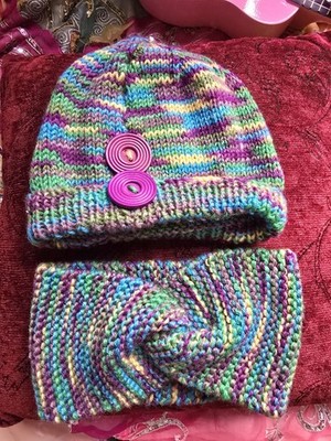 Striped Button Beanie and Matching Twisted Headband Artisan Made Hand Knitted