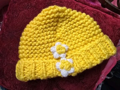 Bright Yellow Beanie Artisan Handmade Daisy Flower Hat One Size Think Wool Mix